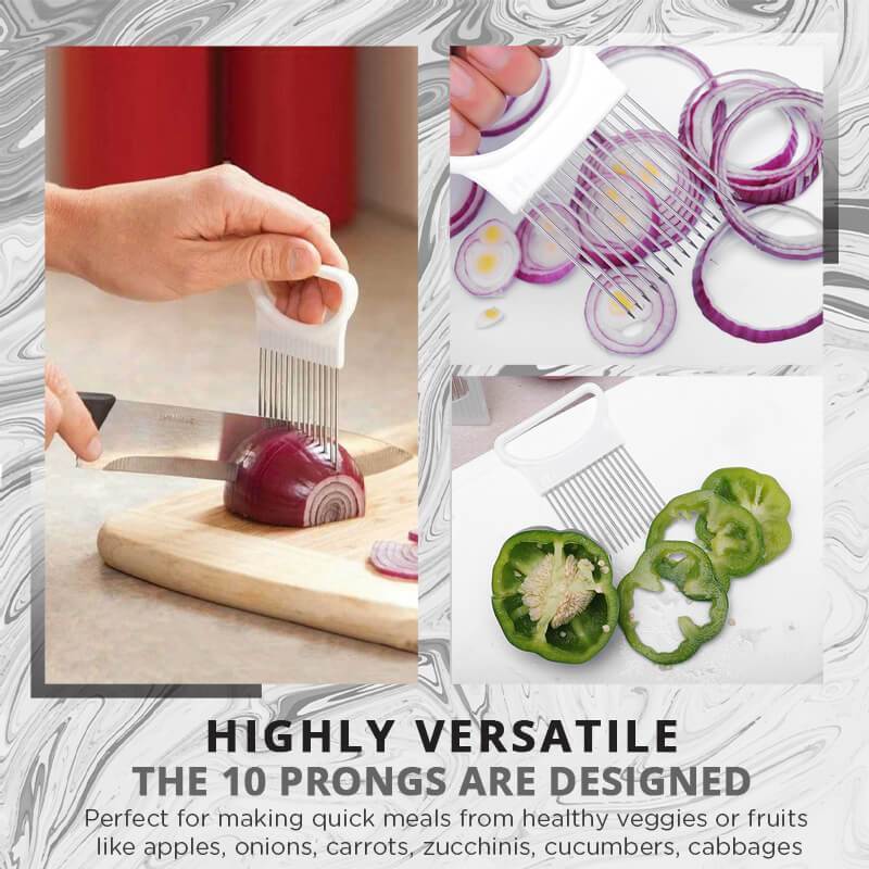 - Die 10 Zinken sind für eine Vielzahl von Schnitten in Tomaten, Zwiebeln, Karotten, Rüben, Kartoffeln und jede Art von Fleisch oder Gemüse geeignet. Sie sind so konzipiert, dass sie kinderleicht zu verwenden, zu lagern und zu reinigen sind.