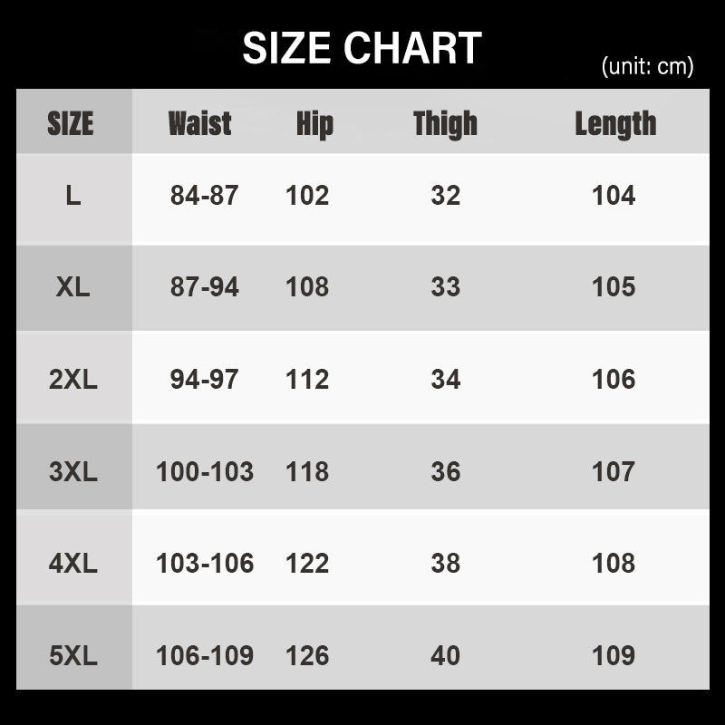 Größe und Farbe – Die Hose ist in Schwarz und Khaki erhältlich und in den Größen L–5XL verfügbar, sodass für jede Körperform die richtige Passform gewährleistet ist.
