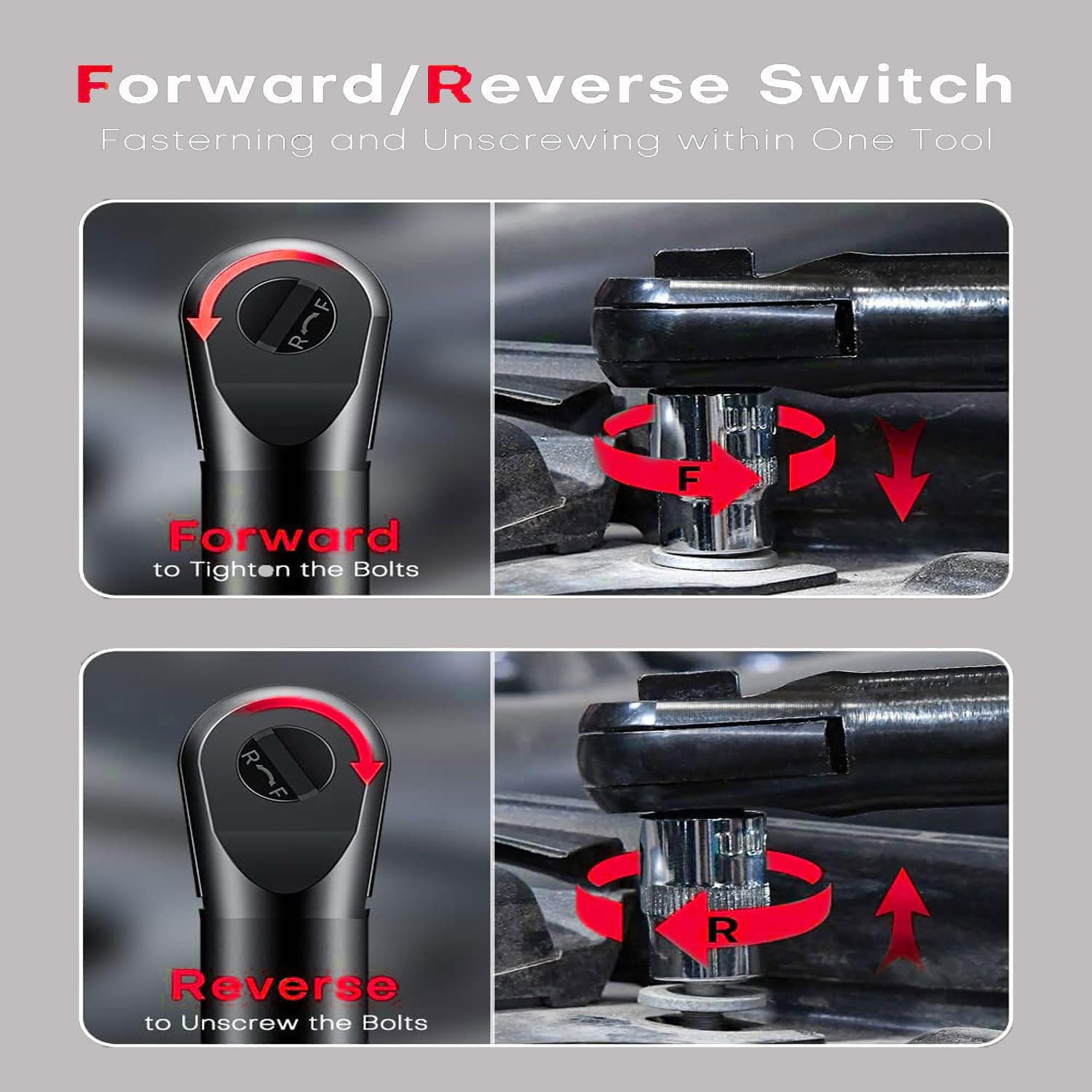 Umschalten zwischen Rückwärts- und Vorwärtslauf: Mit einer Drehung können Sie den Rückwärts- und Vorwärtslauf dieses Ratschenschlüssels umschalten.