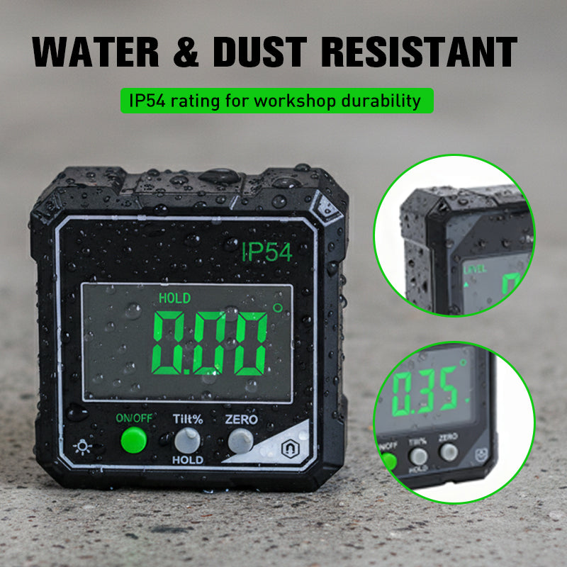 VERBESSERTER UMWELTSCHUTZ: Mit der Schutzart IP54 für Wasser- und Staubbeständigkeit ist dieser Winkelmesser für Werkstattabfälle und leichte Feuchtigkeit ausgelegt – ideal für den Einsatz in Innenräumen oder unter schwierigen Außenbedingungen.