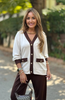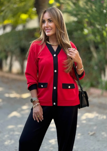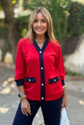 STILVOLLES KONTRAST-DESIGN: Das Oberteil in Rot und Marineblau mit kontrastierenden Ziernähten und Knöpfen im Perlenstil sorgt für einen schicken, eleganten Look, der sich perfekt für legere oder halbformelle Alltagskleidung eignet.